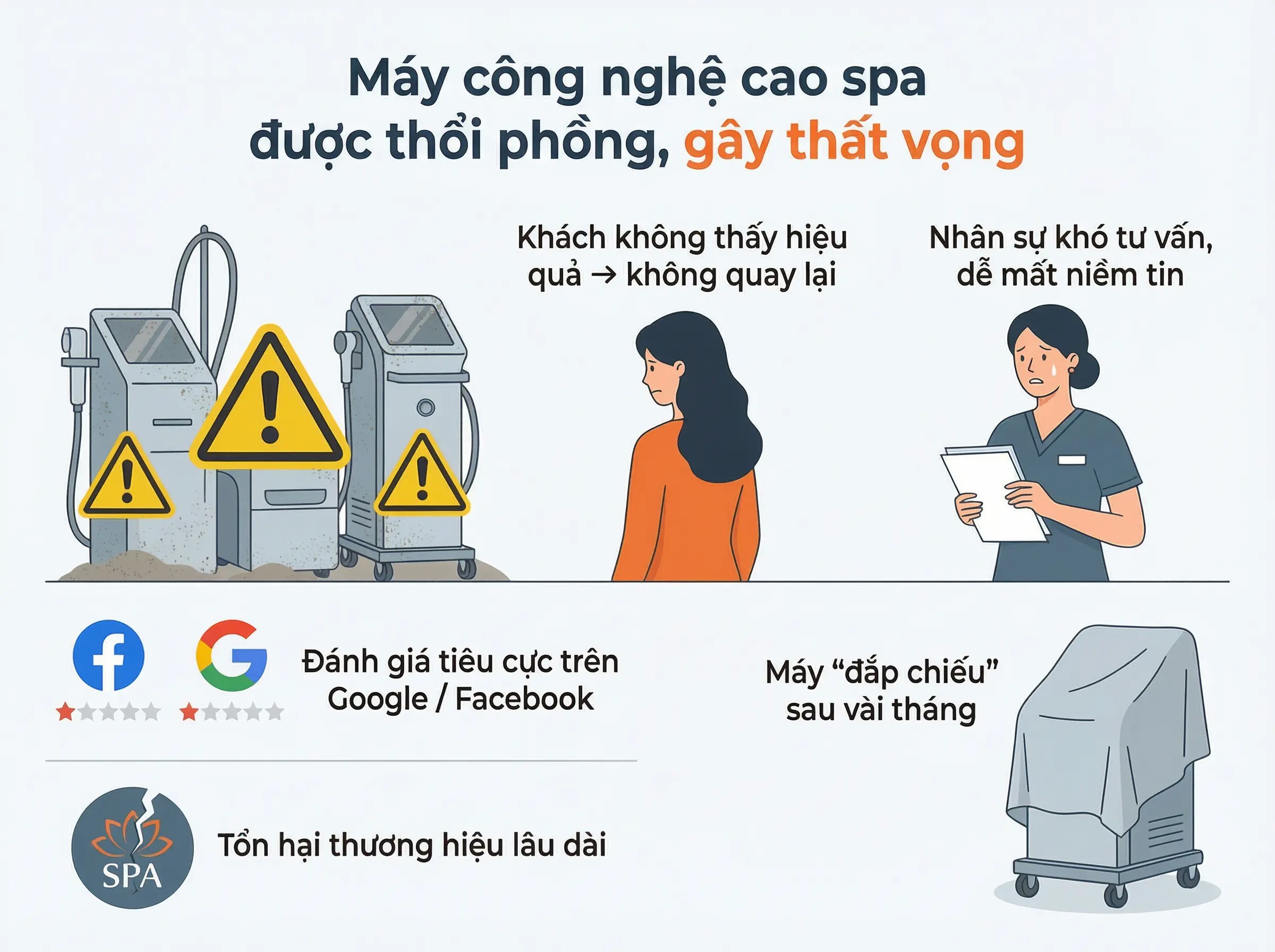 Tuy nhiên, không phải công nghệ nào được quảng bá rầm rộ cũng thực sự mang lại hiệu quả như lời đồn. Nhiều chủ spa đã phải trả giá đắt vì đầu tư nhầm thiết bị: khách hàng không hài lòng, tỷ lệ quay lại thấp, thậm chí ảnh hưởng nghiêm trọng đến uy tín thương hiệu.
