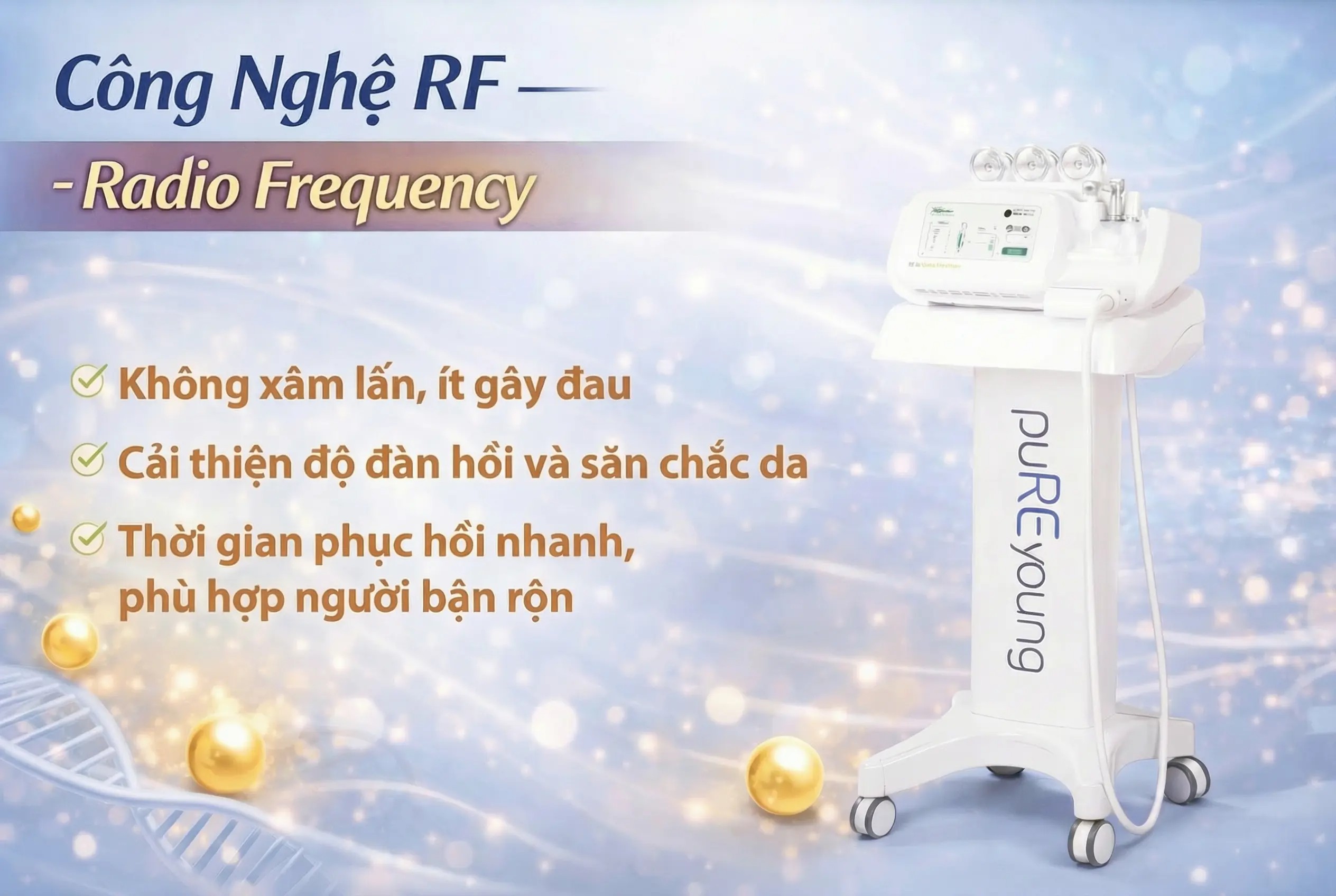 RF (Sóng cao tần) hoạt động dựa trên cơ chế tạo nhiệt ở lớp trung bì, kích thích sản sinh collagen mới, giúp da săn chắc, mịn màng và cải thiện nếp nhăn nhẹ.